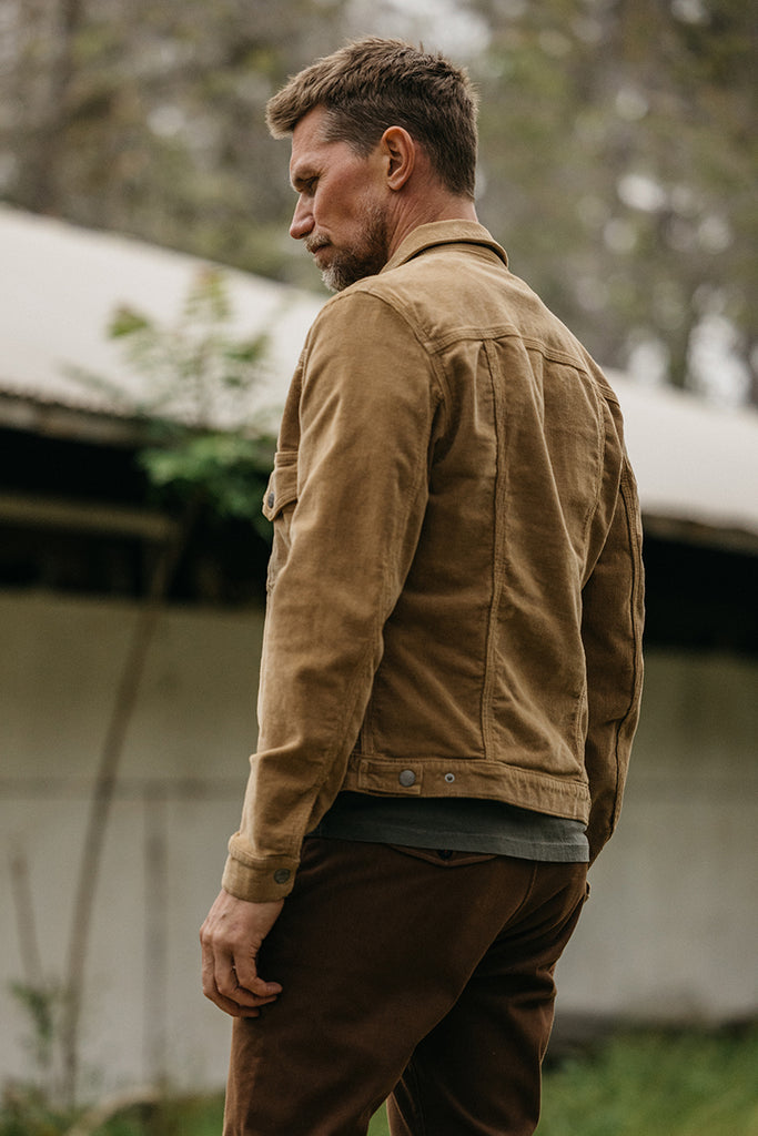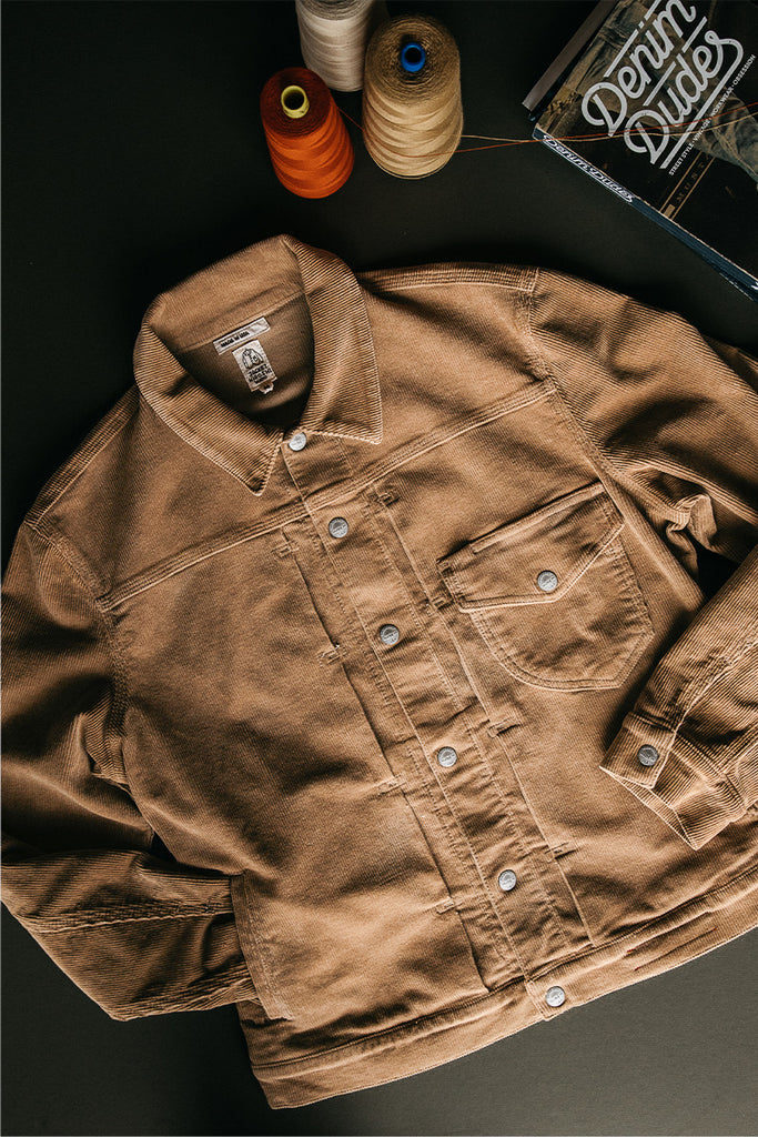 Classic fit, medium crop. 16 Wale Stretch Corduroy trucker jacket. Hand warmer pockets, pleated front, and triple stitched seams. Made in USA.