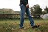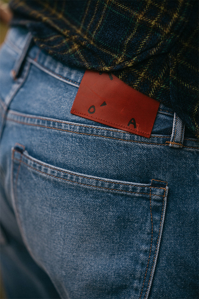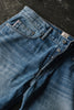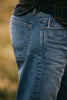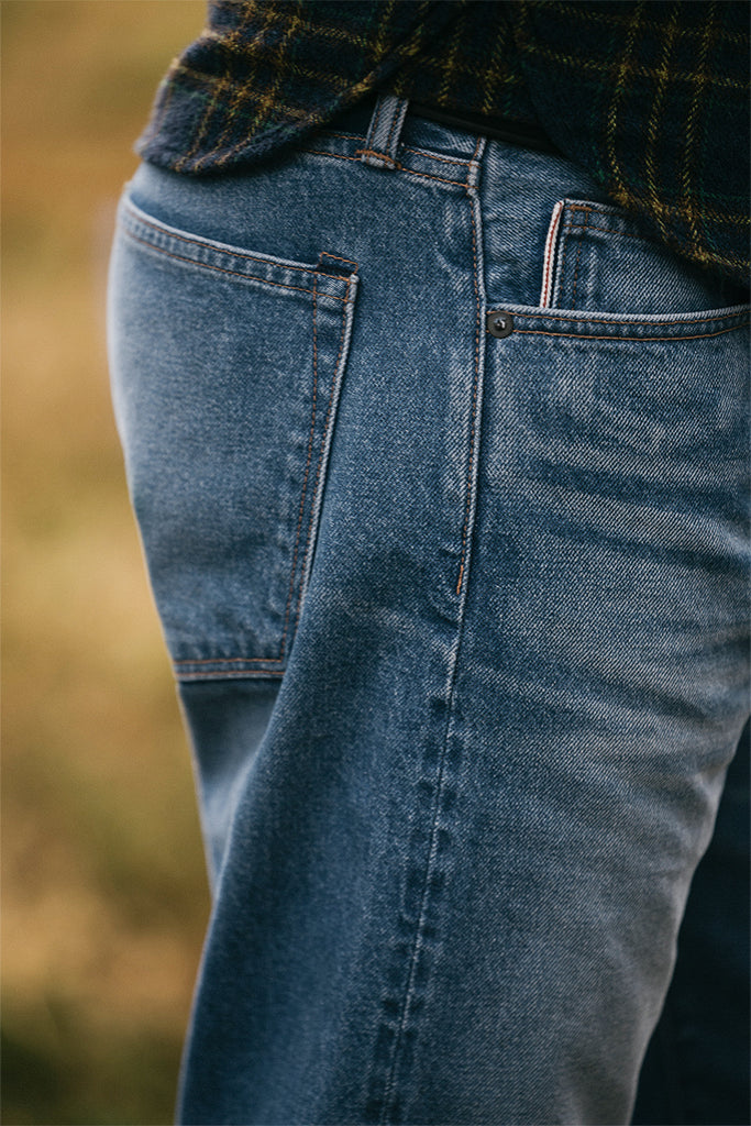 The Hammer Straight in a 100% cotton Indigo 12.5oz Natural Slub denim. Replicating an old heavily worn pair of vintage jeans, This level of fading would take many years to achieve.