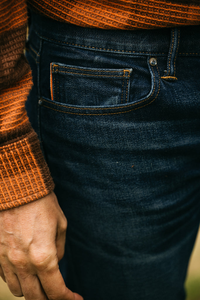 Slim fit, medium rise, vintage fade Indigo Japanese 14oz 4-WAY STRETCH SELVEDGE ™, zip fly, premium leather patch, and custom-branded hardware. Made in USA.