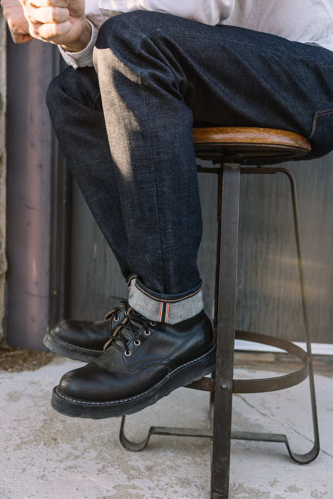 Inside, a Kato signature orange stitch on the tongue and Hiroshi Kato branding just below the boot collar signal the collaboration’s attention to detail. Oxidized brass eyelets, paired with a black leather drawcord, offer a subtle industrial touch. The leather midsole and four eyelets with 2 speed hooks balance refined structure with rugged functionality. These boots are built to break in beautifully and mold to your feet over time.