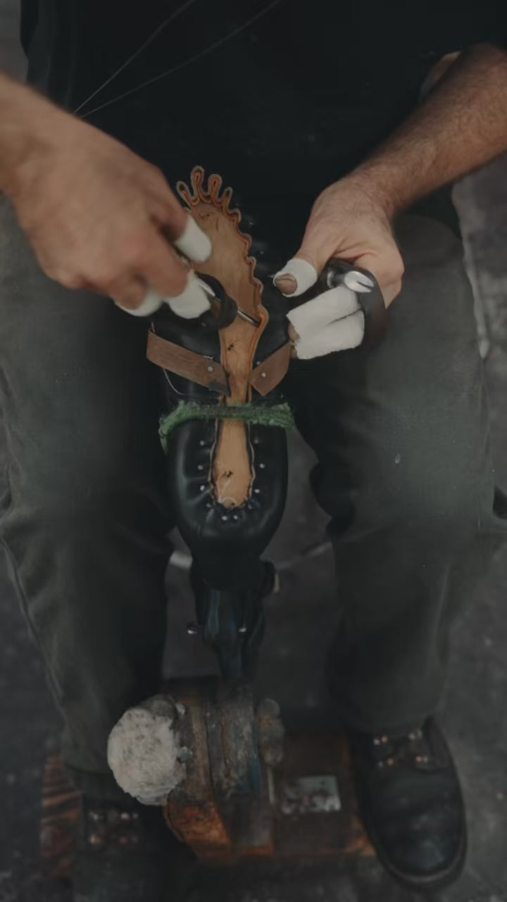 The upper is crafted from full-grain, black Teacore Chromexcel leather from Horween Tannery— a celebrated full-grain, combination-tanned leather known for its supple feel, rich luster, water resistance, and character. Teacore leather is prized for the way it ages due to the way it is dyed. Over time, the black outer dye wears down, exposing warm brown tones underneath. This natural change gives the leather a rich, vintage character that continues to gain depth with age.