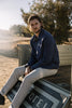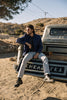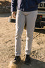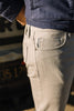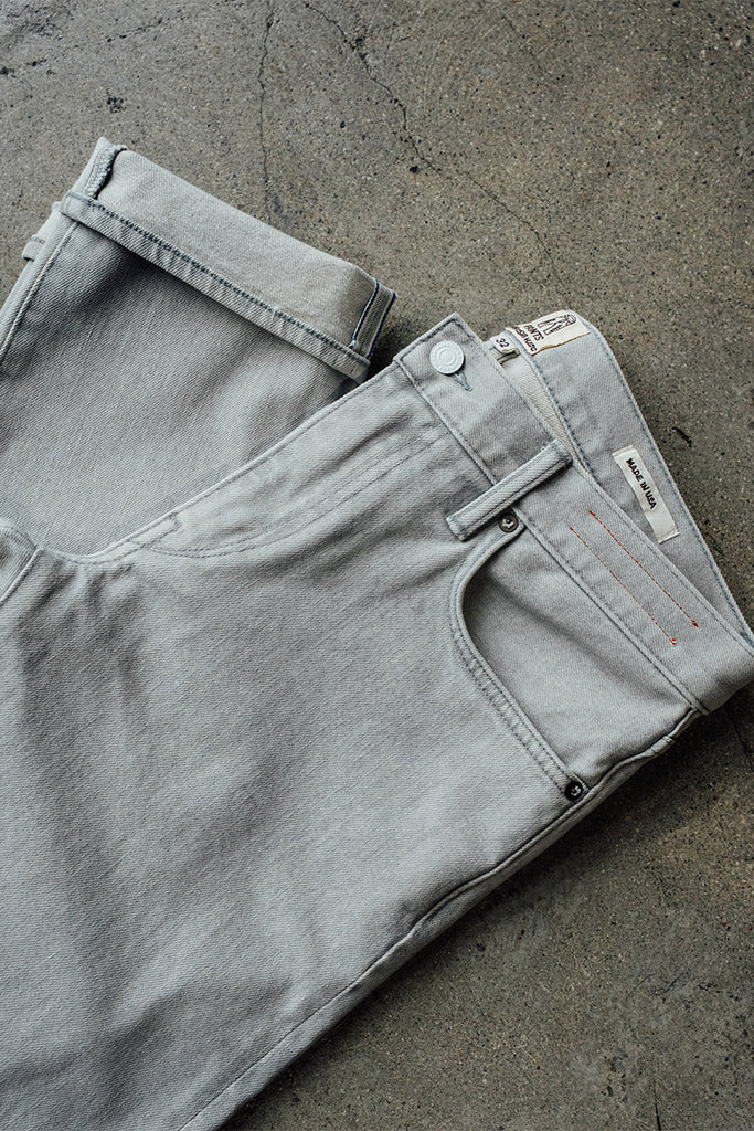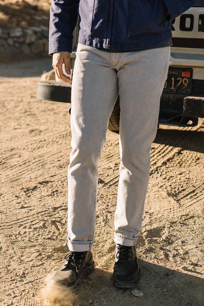 The Pen Slim in Marble is a 14 oz 4 way stretch selvedge bleached down to a stark gray-white that feels raw and refined all at once. The black selvedge ID adds a sharp contrast.