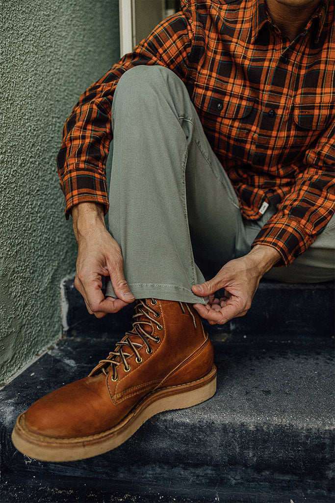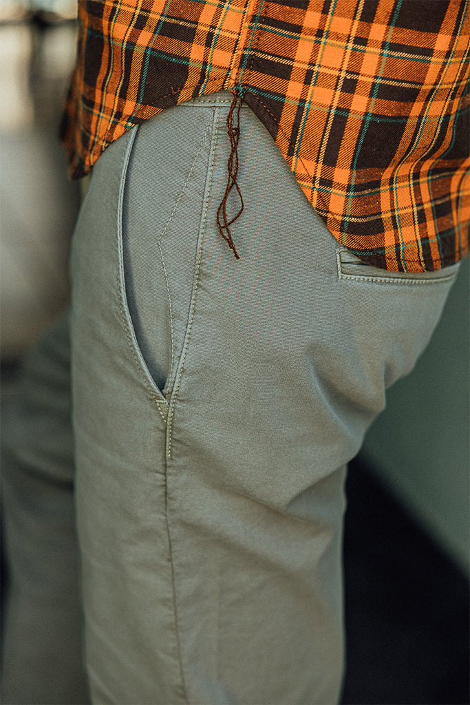 The Pipe Straight Chino is a more relaxed, tapered take on our iconic Axe Slim fit. It carries over all the classic details—military-style sewn waist button, welt back pockets, and zip fly—now updated with slanted front pockets and our signature “K” stitch. This new iteration of chinos have been made with a stretch oxford fabric. Garment-dyed for a rich character, these unassuming chinos will be the ones you reach for time and time again and will age beautifully over the years.