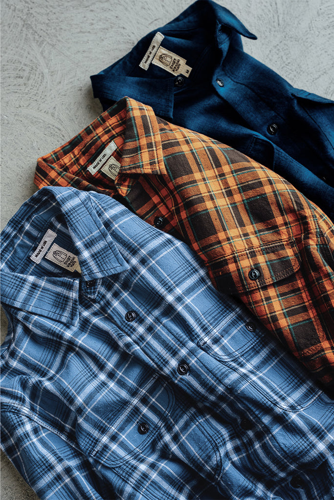 Classic fit. 100% Cotton, brushed plaid flannel fabric, triple stitched shoulders, back and side seams, bar tacked reinforced pockets, pen pocket, cat eye buttons, chainstitch run off on side seams. Made in USA.