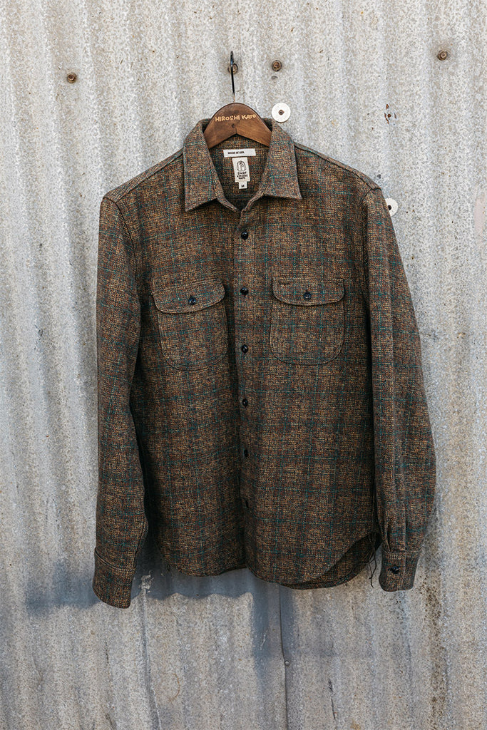 Another Kato original utilizing our Twisted Yarn Plaid fabric but this time with a subdued pattern for a more subtle approach to this beautifully textured American made flannel. The intricate look of this fabric is achieved by twisting grey, beige, and natural white yarns into the color yarns, giving it a unique color variation similar to a wool fabric. Because it is 100% cotton, The Brace shirt is far softer than most wool garments.